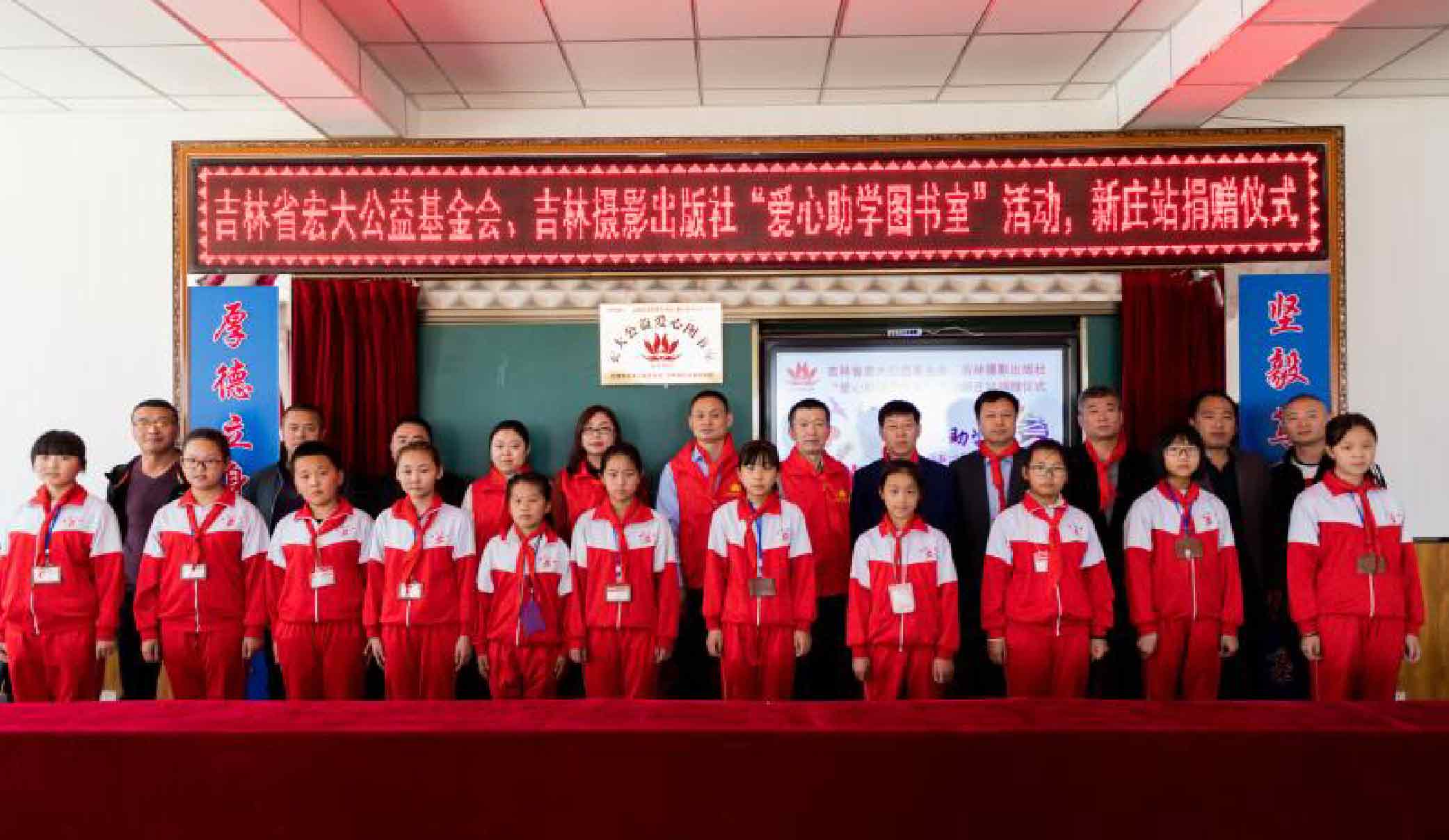据新庄镇中心小学校长关朋祥介绍,该校有近1500名学生,20多个班级。贫困家庭的孩子比较多,一套校服60元钱,有些孩子十分喜欢但是没有经济能据新庄镇中心小学校长关朋祥介绍,该校有近1500名学生,20多个班级。贫困家庭的孩子比较多,一套校服60元钱,有些孩子十分喜欢但是没有经济能力购买,老师们看着心里酸酸的,甚至留下了泪水。课外书籍对于很多孩子来说更是一种奢侈品。吉林摄影出版社本次向贵校捐赠图书3000册,价值44520元。这些书籍按照分类放到每个班级的图书角,孩子们可以轮流借阅。同时,吉林摄影出版社“爱心图书室”正式在贵校挂牌。