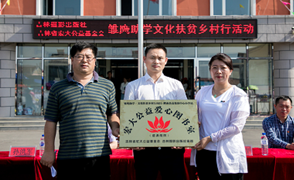 雏鹰助学,文化扶贫乡村行活动走进辉南县贫困山村 在“六·一”儿童节这个属于孩子们的节日里,由辉南县创意农业协会组织发起,吉林省宏大公益基金会携手吉林摄影出版社走进辉南县高集岗中心小学和样子哨镇万宝小学,为孩子们送去了吉林摄影出版社出版的世界名著、名人故事、畅销青少年读本等与青少年成长息息相关的图书及节日的祝福。  万宝小学接受捐赠的图书 雏鹰助学,文化扶贫,是吉林摄影出版社以实际行动认真落实党中央文化扶贫精神的重要举措。本次向辉南县高集岗中心小学和样子哨镇万宝小学分别捐赠图书1000册,总价值42460元。并为以上2所小学建立爱心图书室。  高集岗中心小学爱心图书室正式成立  样子哨镇万宝小学爱心图书室正式成立 6月1日上午8:30分,捐赠仪式在高集岗中心小学率先启动。高集岗中心小学校长崔玉洁说:“学校一定会将这些图书利用好,发挥最大的作用。”  高集岗中心小学领导和同学们与捐赠方合影 6月1日上午10时,吉林摄影出版社及宏大公益基金会的领导及工作人员一行来到了样子哨镇万宝小学,这是地处辉南县大山中非常贫困的一所小学,全校教师10人,学生80人。我们在学校看到了为数不多的课外图书,巧合的是有四分之三的图书是吉林摄影出版社出版的儿童读物。万宝小学校长刘同义告诉我们,“这些图书是县教育局给学校配发的,孩子们很喜欢。”  捐赠方与样子哨镇万宝小学校领导合影 吉林摄影出版社社长孙洪军表示:“农村及农村儿童的困难很多,林林总总,表面上看是经济问题,归根到底是教育问题,是智力问题。图书所带来的价值是远远超过它自身的价值,它会在潜移默化中润泽人的品格,开阔人的视野,提高人的智力,规范人的行为。”期望这些图书可以扩宽同学们的视野,提高知识储备,陶冶性情,体验更丰富的人生。  吉林摄影出版社社长孙洪军讲话 吉林省宏大公益基金会理事吴尽说:“‘雏鹰助学文化扶贫乡村行’活动旨在弘扬‘爱心助学,扶贫帮困’这一中华传统美德,并从小培养孩子们的感恩之心。” 此次来到辉南县高集岗中心小学是我社2018年度“文化扶贫乡村行”活动的第四站;样子哨镇万宝小学为第五站。吉林摄影出版社会将这份爱心一直传承下去,让贫困地区的孩子们感受到来自社会各界的关爱。